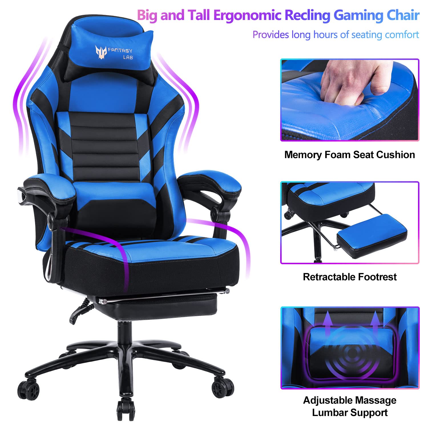 Amazon Com Fantasylab Big And Tall Gaming Chair With Footrest 400lb Gaming Chair Massage Gaming Chair Memory Foam Adjustable Tilt Back Angle And Arm High Back Leather Racing Computer Office Chair Home